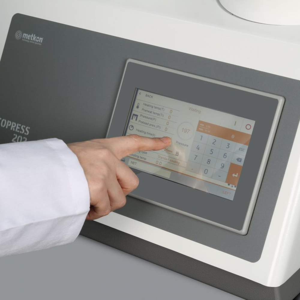 7" HMI touch screen control, with Siemens PLC control unit, programmable with colored LCD display, program based mounting sequences, electro hydraulic pressure (requires no air), pressure up to 300 bar, temperature up to 2000C, operation time up to 35:00 minutes, short cycle time, thermostatically controlled heating power of 1650W, automatic cooling cycle with three modes of cooling rates(standard cooling, slow cooling and based on time), programmable preheating and preloading, stand-by temperature, selectable mould sizes from 25 mm to 50 mm, easy to close bayonet closure, audible warning signal, ready for operation. 230 V, 1-phase, 50/60 Hz. Mould assemblies are ordered separately.